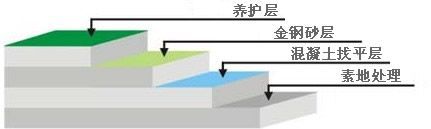 3. 金鋼砂層:先將2/3硬化劑(金屬骨料或非金屬骨料)均勻撒布,讓材料充分吸收混凝土中水份,用抹光機械抹平;再將余下1/3硬化劑均勻撒布,抹平。當混凝土不被破壞時,再抹平,收光;