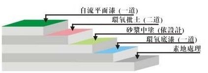 ⑥自流平面漆:用自流平型環氧面漆均勻鏝涂一道,完工后達到光亮潔凈,顏色均一,無空鼓;